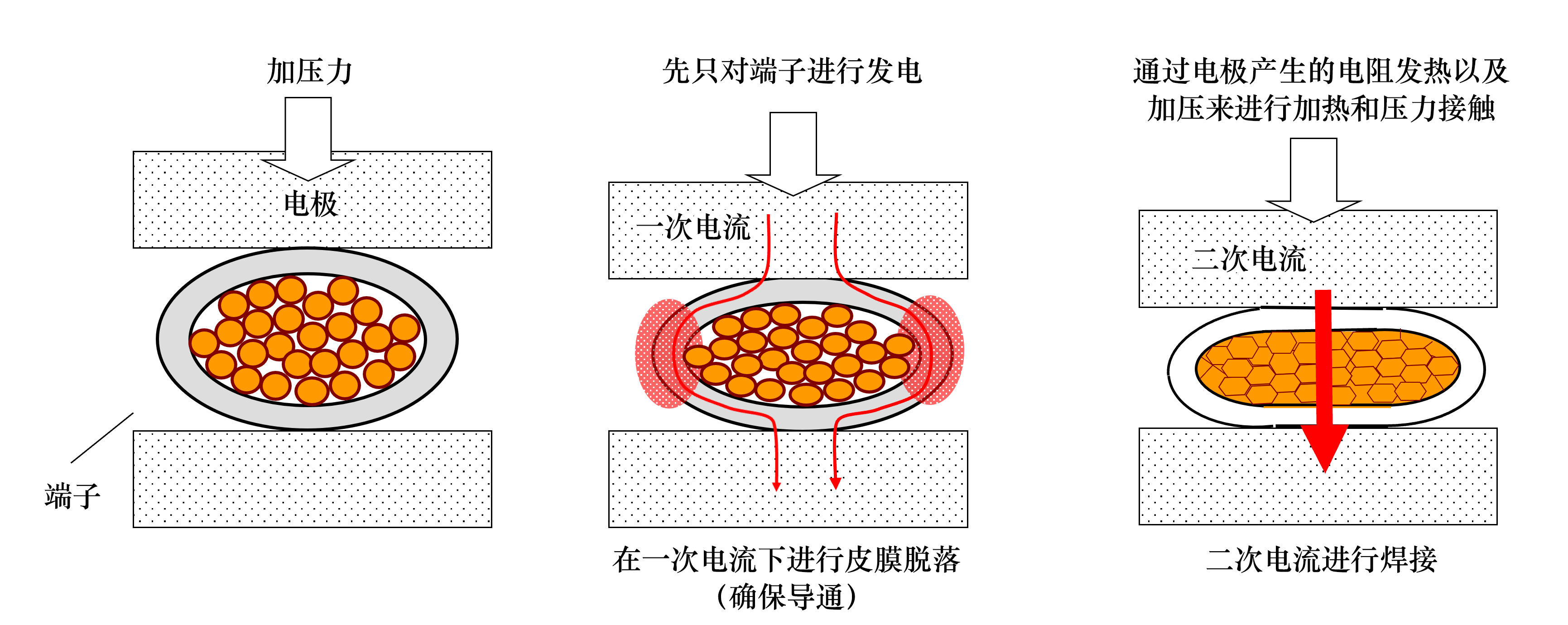 先只对端子进行发电时,皮膜才会开始剥离。通过电极产生的电阻发热以及加压来进行加热和压力接触。